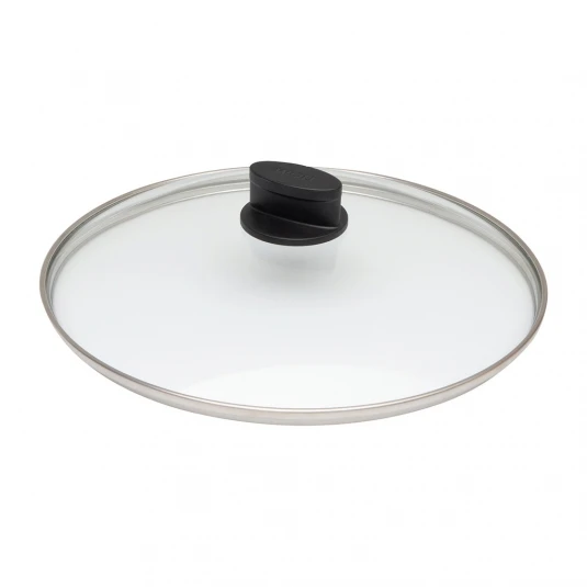 Coperchio in vetro temprato trasparente, dotato di uno sfiato permanente per il vapore e di un bordo in acciaio antiurto.