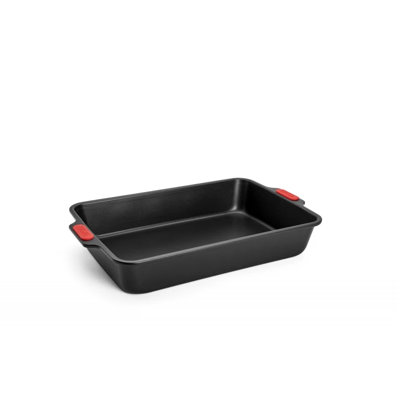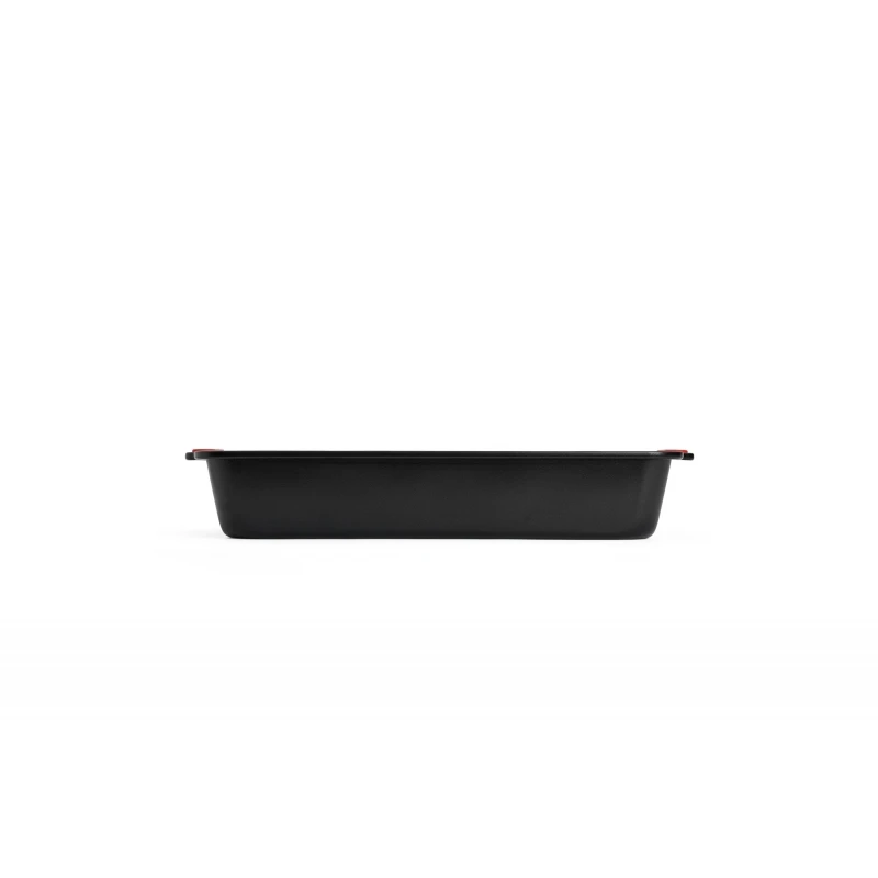 Lo stampo rettangolare in acciaio è composto da una superficie antiaderente a doppio strato con polvere di diamante. I due manici all’estremità con prese in silicone sono resistenti al calore e garantiscono una presa sicura.