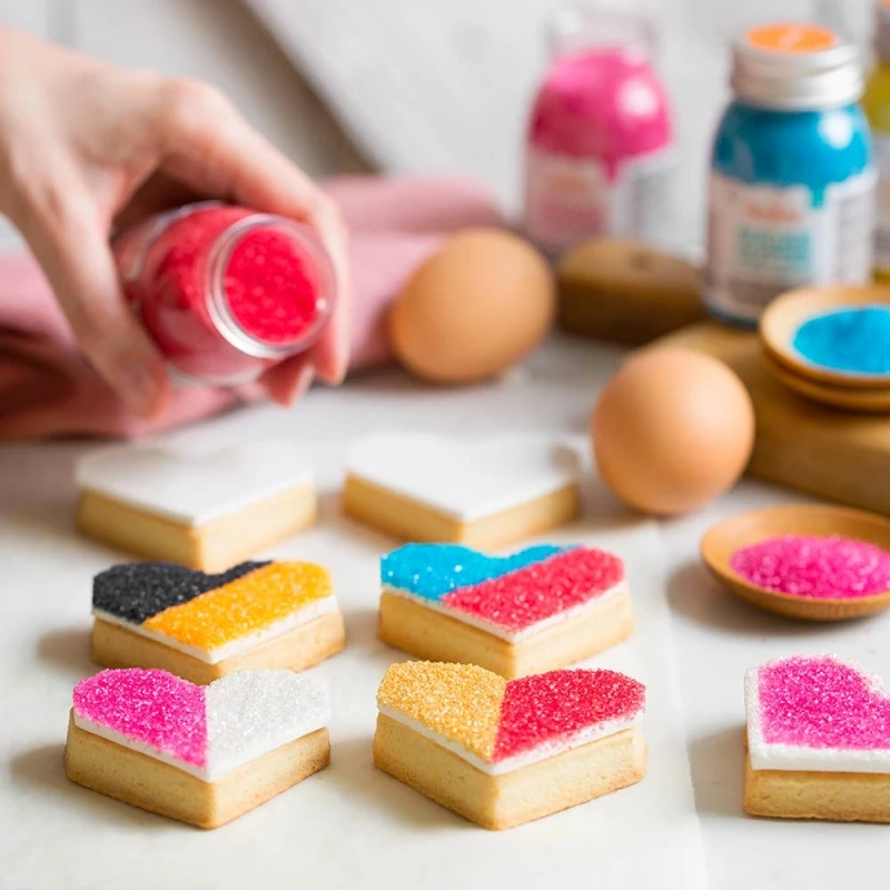 Zucchero extra-fine, vivace e brillante, prodotto con coloranti di estrazione naturale, perfetto per riempire, decorare e arricchire torte, biscotti e cupcakes.